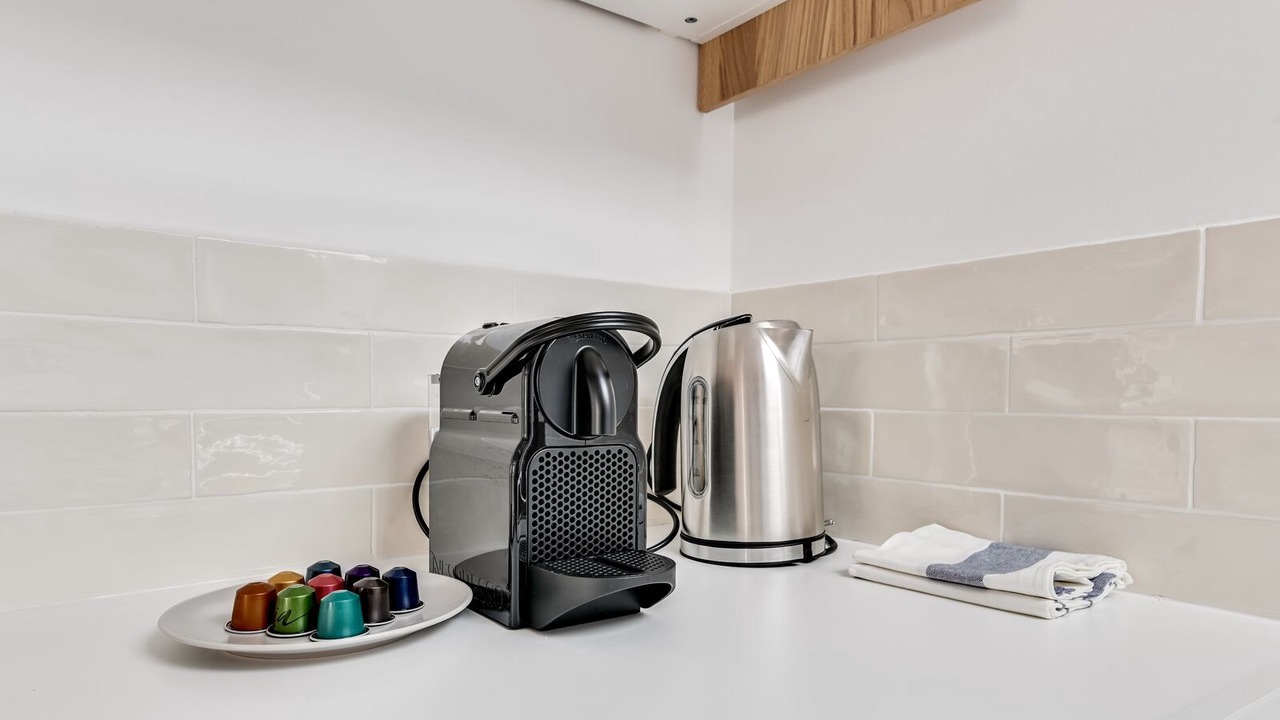 - Open-plan kitchen fully equipped with coffee, sugar and tea capsules