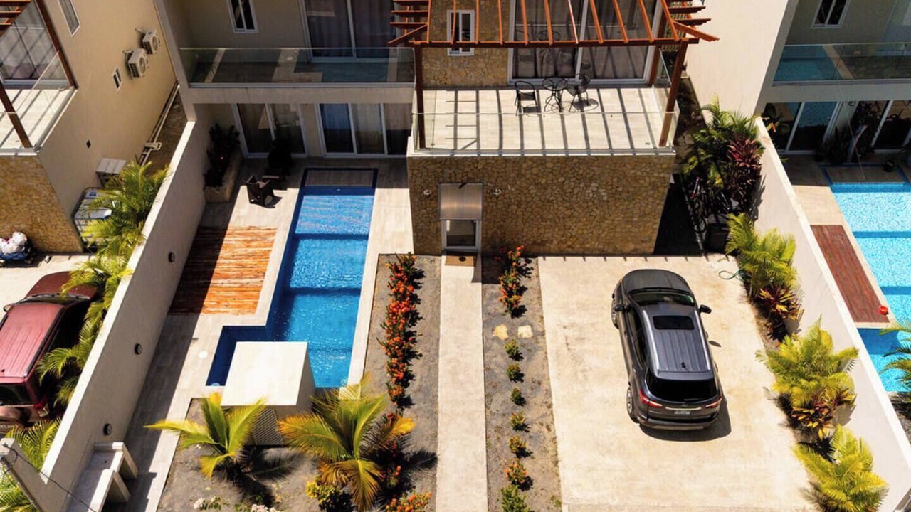 Enjoy this modern and spacious villa in a peaceful and secure residential area of Roatán. Includes a 2018 Ford EcoSport SUV (full extras). Just 7 minutes from the airport and 2 minutes from the ferry terminal. The villa features 3 bedrooms, 3.5 bathrooms, a private pool with cascade, entertainment area with convertible game table, full kitchen, washer/dryer, smart TV, and private parking.