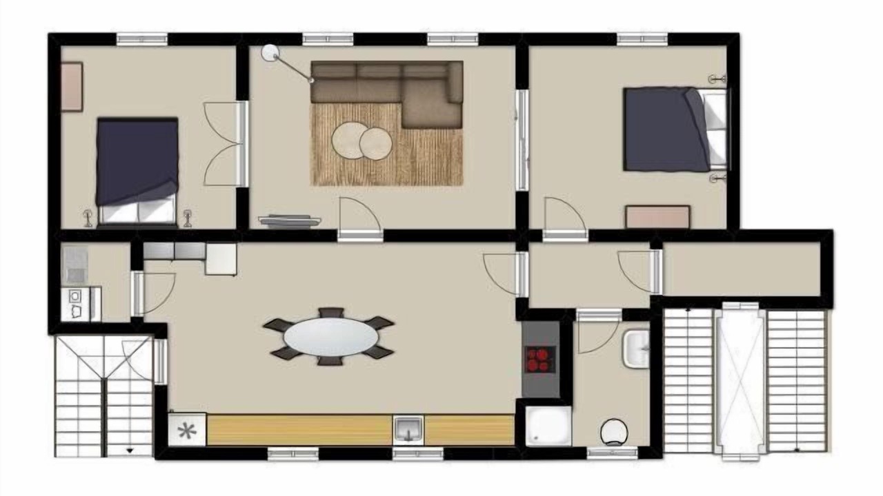 Inside, the apartment boasts a spacious dining kitchen with a separate utility room, a bright living room, and two generously sized bedrooms. The bedrooms are positioned on either side of the living area, with all rooms seamlessly connected by elegant French doors. The bathroom is well-proportioned, and the apartment comes fully equipped with all essential white goods.