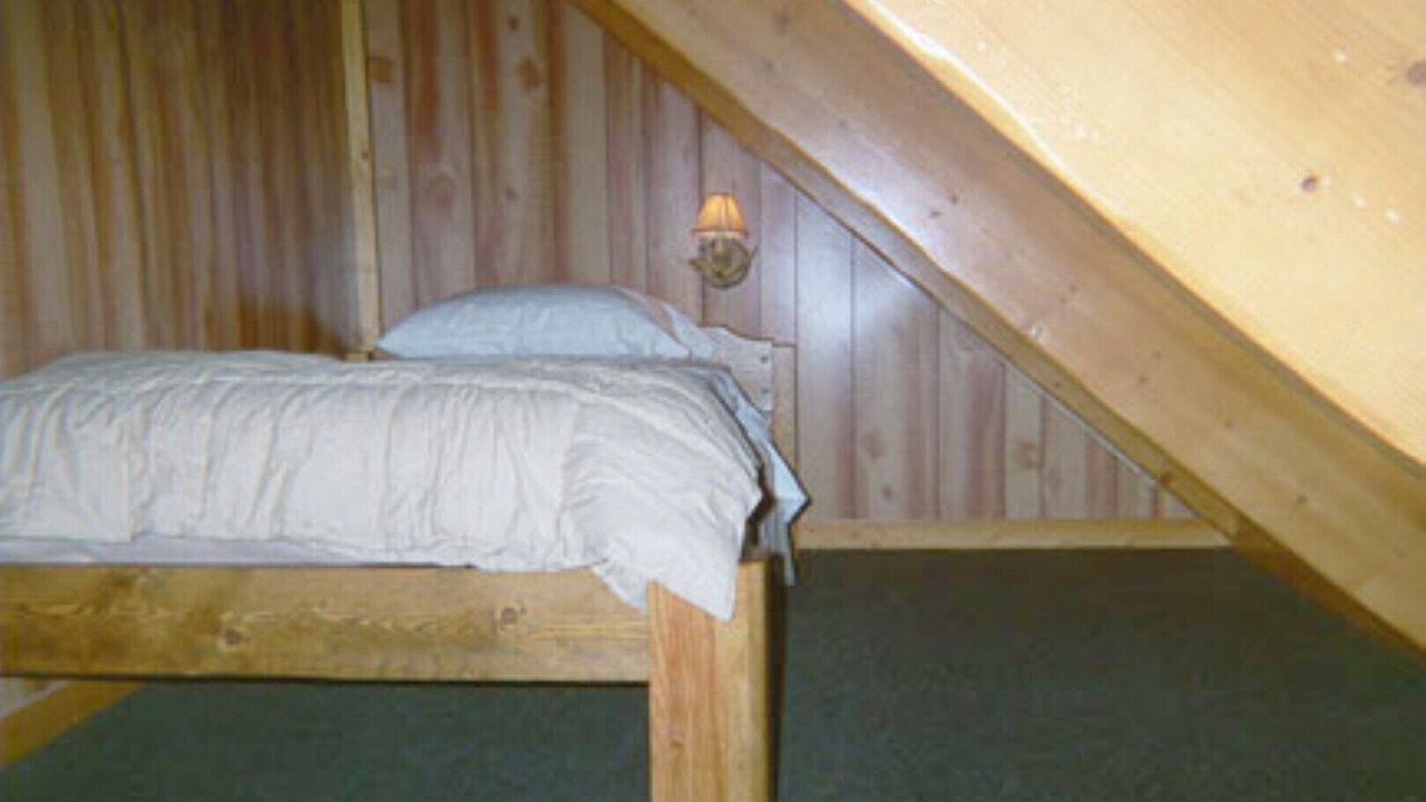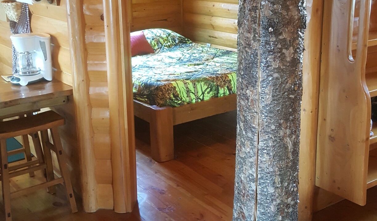 The Covey a cabin has one main bedroom with full size bed ( Bedding provided in main bedroom only). Has 2 lofts with 1 single Log bed, second loft perfect for youth w/ 2 sleeping bags. 2 single pull out couches in family room with TV. Kitchen that overlooks a fishing lake, sat TV, AC heat, very private location. RECOMMEND BRINGING YOUR FAVORITE PILLOW AND SLEEPING BAG.
