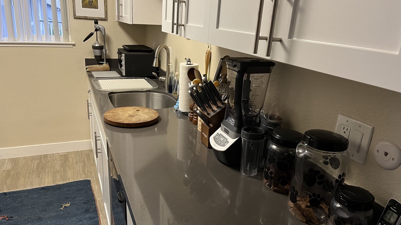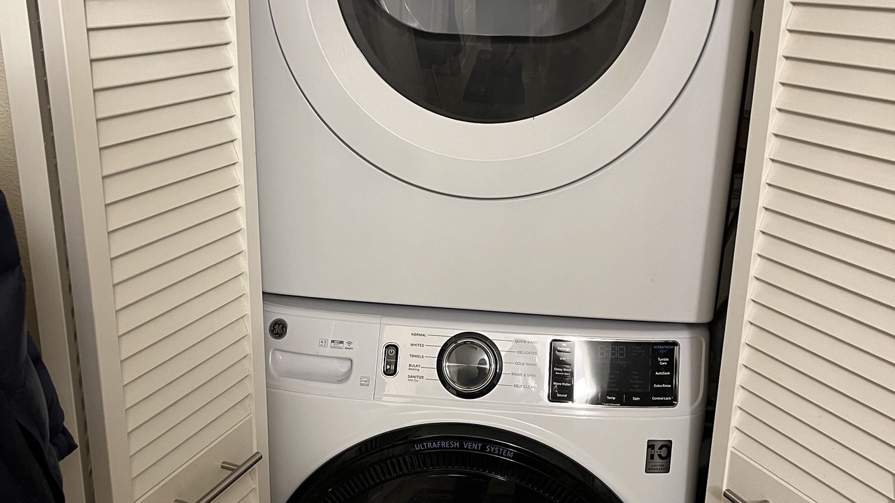 The kitchen is fully-equipped, with a refrigerator, stove, oven, dishwasher, microwave, toaster-oven, air fryer, and blender, and there is a clothes washer and dryer in the apartment.