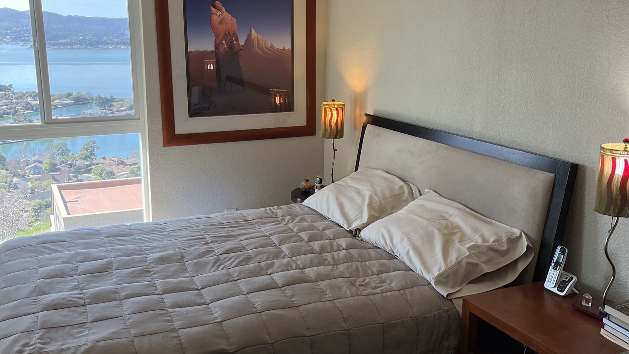 Beautiful and peaceful apartment one mile from downtown Tiburon, and less than 20 minutes by car and 30 minutes by ferry from San Francisco. The large bedroom has a queen bed and a convenient desk with Mac desktop computer and printer. Spacious living room with grand piano and large-screen TV. Both the bedroom and living room have access to a large balcony with gorgeous views of Mt. Tam, the Belvedere Lagoon and Richardson Bay--a perfect place to view dazzling sunsets.