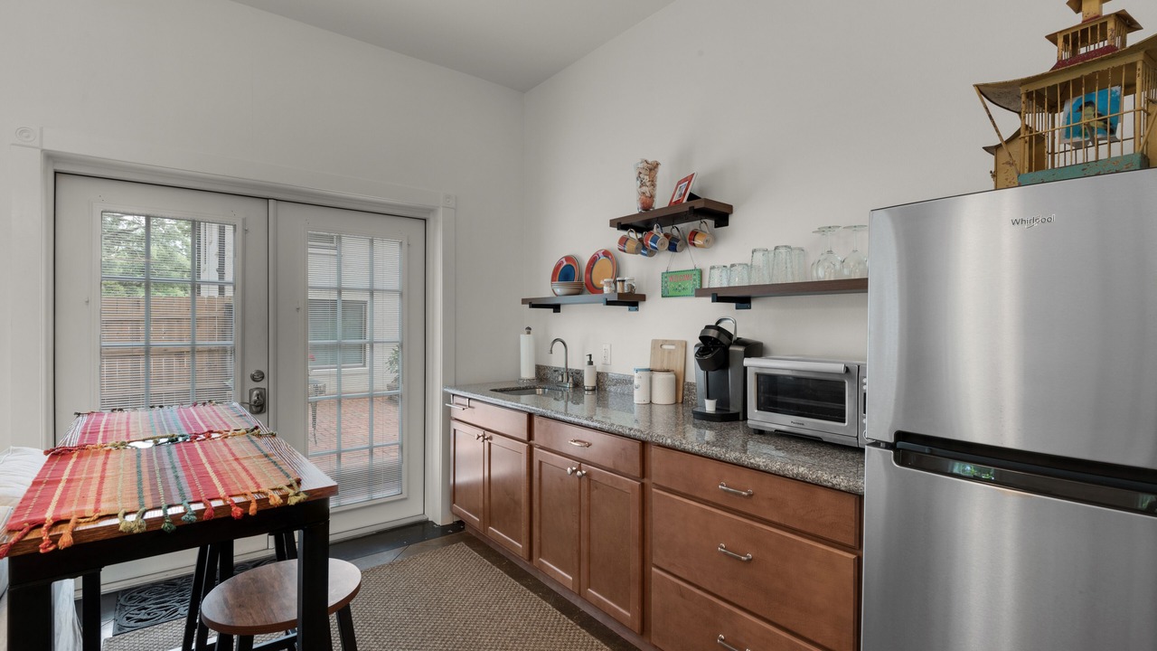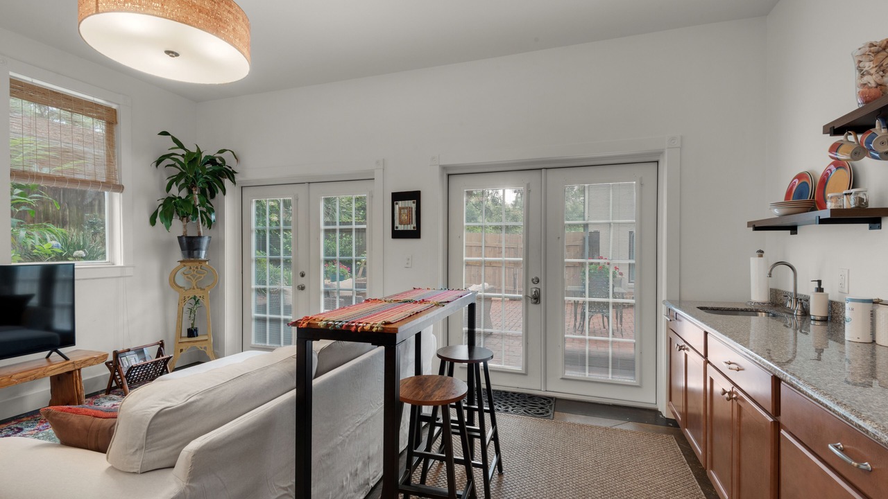 The guesthouse cottage has a kitchenette with refrigerator, toaster oven, microwave and a Keurig machine for your morning coffee. The guesthouse is not ventilated so no cooking is allowed nor do we allow guests to bring their own cooking appliances. You'll want to spend time inside or outside in the lovely courtyard with a cup of coffee or a glass of wine and your favorite book, phone, or computer during your down time. You will enjoy high speed internet/ wifi and a smart TV for your entertainment in the living room and bedroom. There is a security camera that monitors outdoor common spaces only. It monitors activity in the driveway area and courtyard.
