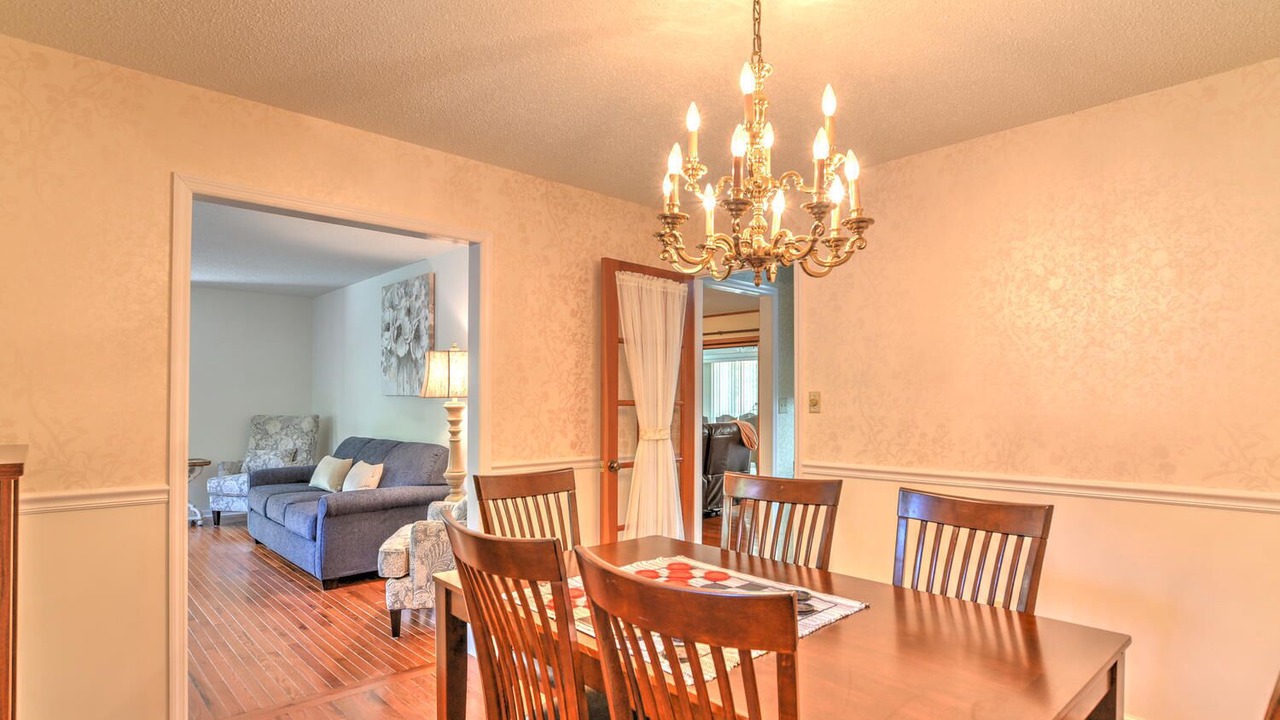 The living room has a flat screen tv with a lounging chair, 2 wing back chairs and a pull out queen bed with memory foam mattress. Beside the living room is a small room for the family to share time together and play board games. A large den has a couch and love seat that have recliners that offer a very comfortable time to watch the flat screen smart tv on cable or with your own acct. There is a large dining room with a table for 8-10 that has views of the back yard where turkeys pass by frequently. The back deck also has a grill and outdoor table and chairs for your outdoor entertaining. There is a fire pit (with wood provided), outdoor seating and outdoor bathroom facility.