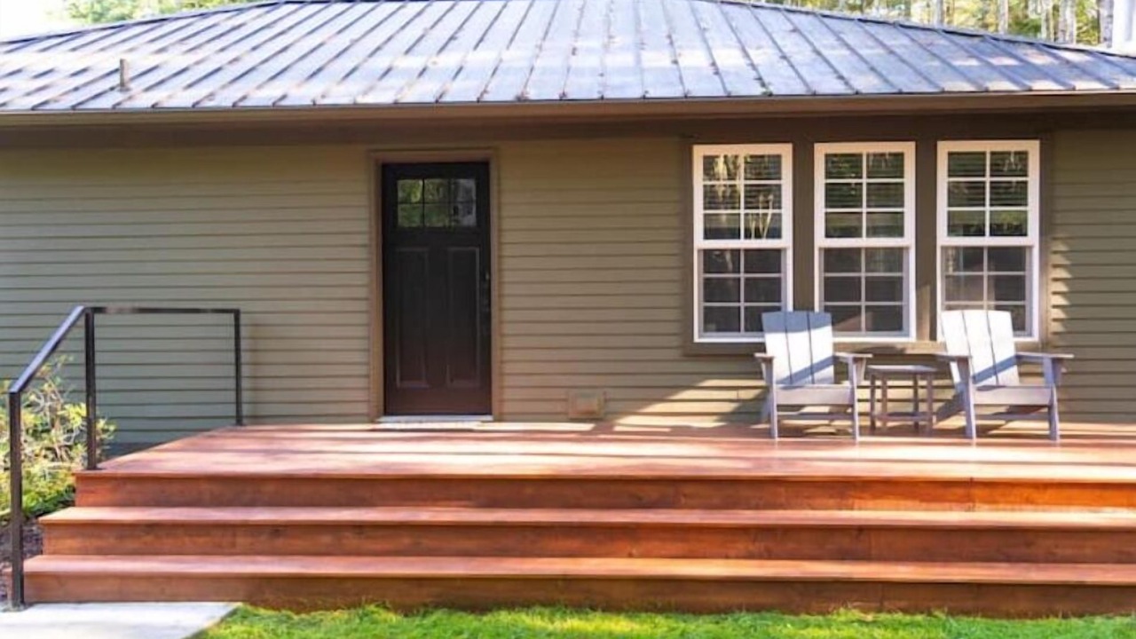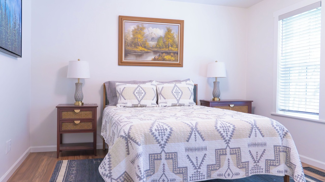 The house itself can sleep up to four and has two bedrooms with a queen-size bed in each and 2 bathrooms, one en-suite with a shower and the other in the hallway with tub/shower. The property itself can host up to 7 people by adding on the detached bunkhouse which has full-size bunk beds and a sleeper sofa plus a half bath.