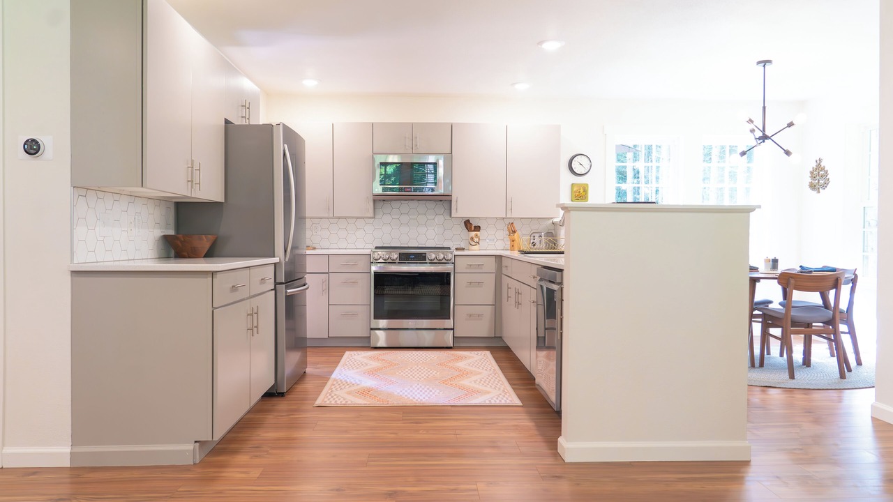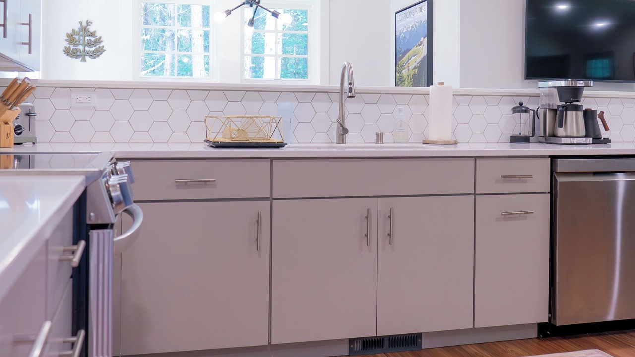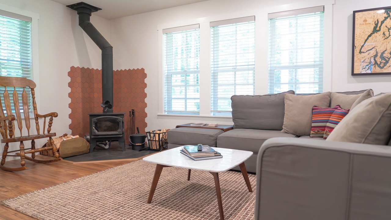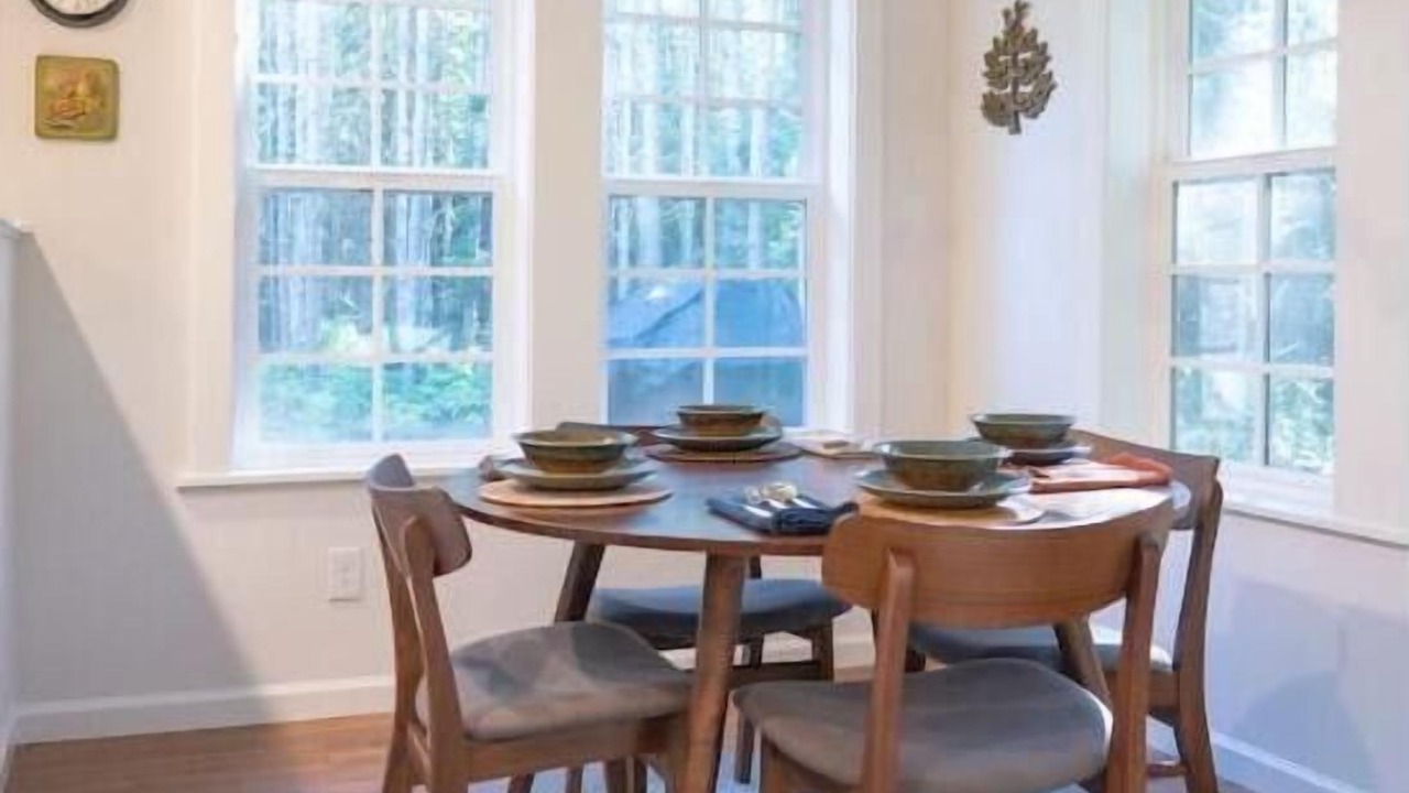 The newly remodeled kitchen invites you to whip up nourishing meals using local ingredients from Port Townsend's farmer's market, Chimacum Farmstand or local grocers. Modern appliances, quality cookware, and ample counter space make home cooking a delight. Enjoy your culinary creations in the adjacent dining area with seating for four while looking out at the fully wooded surroundings.