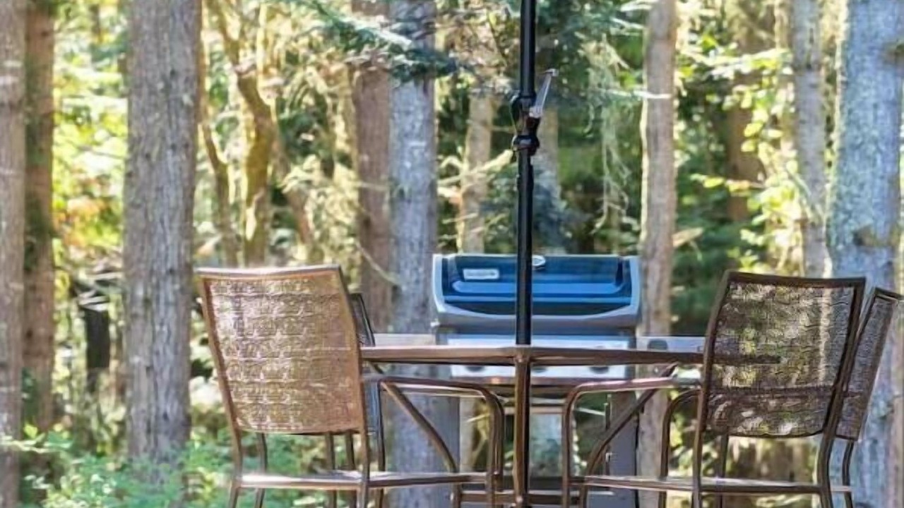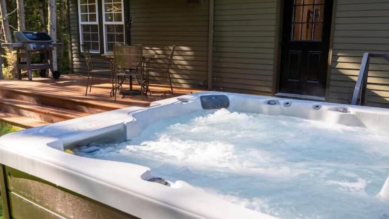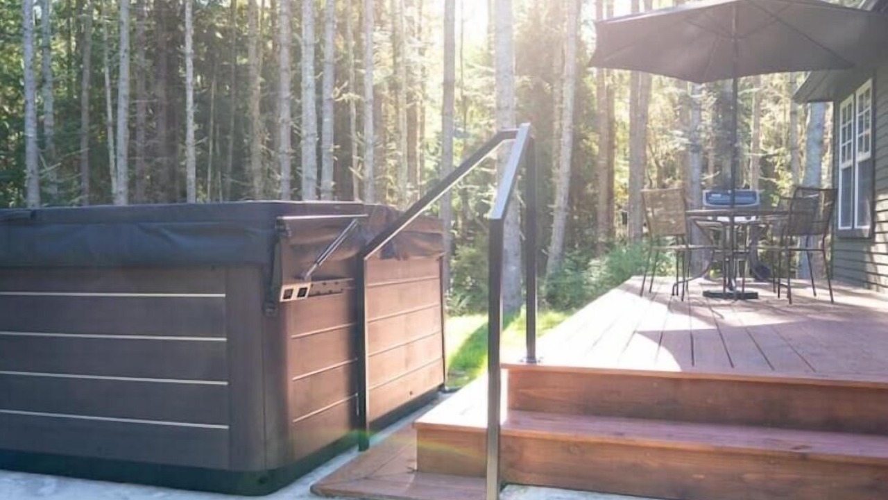 Outside the back deck is a brand new jetted hot tub with LED display, strong therapeutic jets, and complete privacy. Lounge in the hot tub while looking out at the forest or up at the stars! There is also a brand new barbecue grill and a four person dining table with umbrella on a large cedar patio deck for outdoor entertaining.