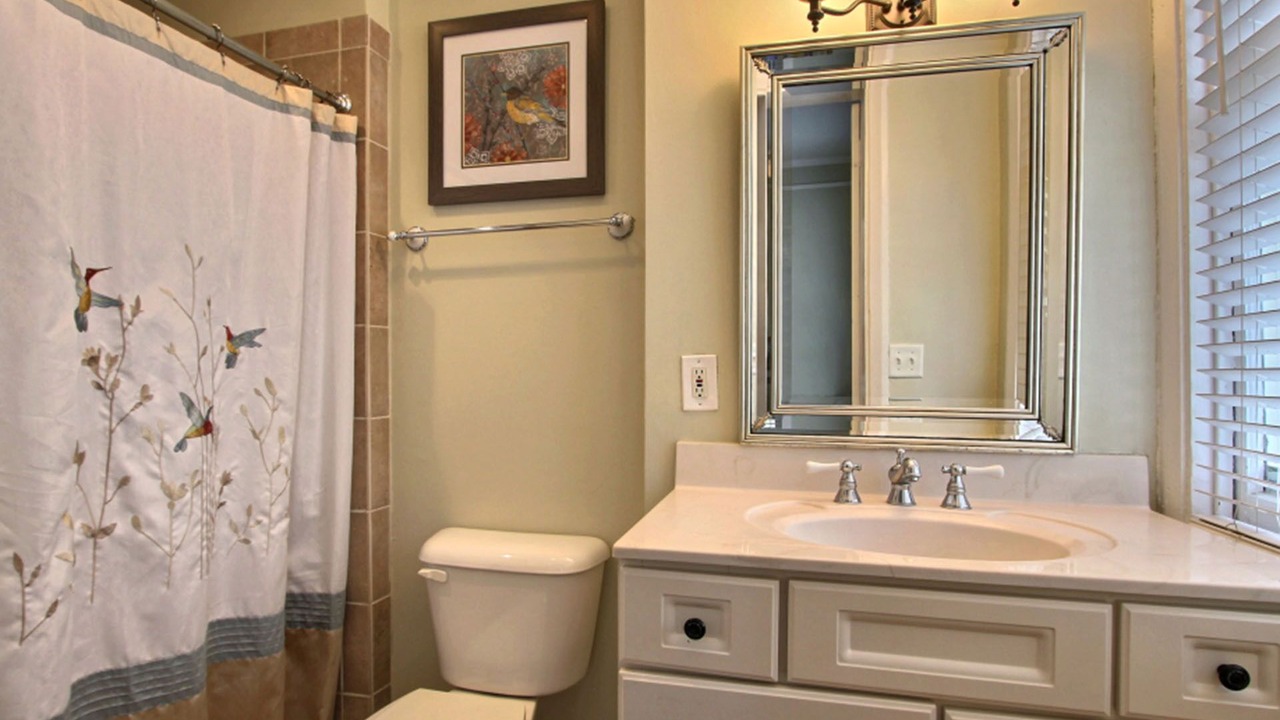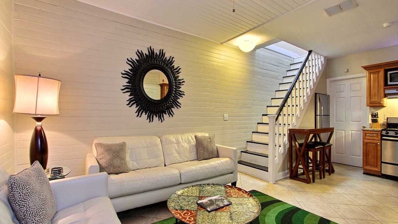 The carriage house features modern couches with a glass coffee table sitting on a cozy rug in the living room area along with a flatscreen TV, kitchen area with stainless steel appliances & granite countertops, a bar stool seating area, and a washer dryer just off the kitchen on the first floor. On the second floor, in the first bedroom on the left there`s a queen sized bed. The second bedroom features a king sized bed as well as a flatscreen TV, and there`s a shared full bath in the hallway, as well as a desk nook area. In summary, the carriage house has a total of 2 bedrooms, 1 bath, and sleeps a total of 4 people.