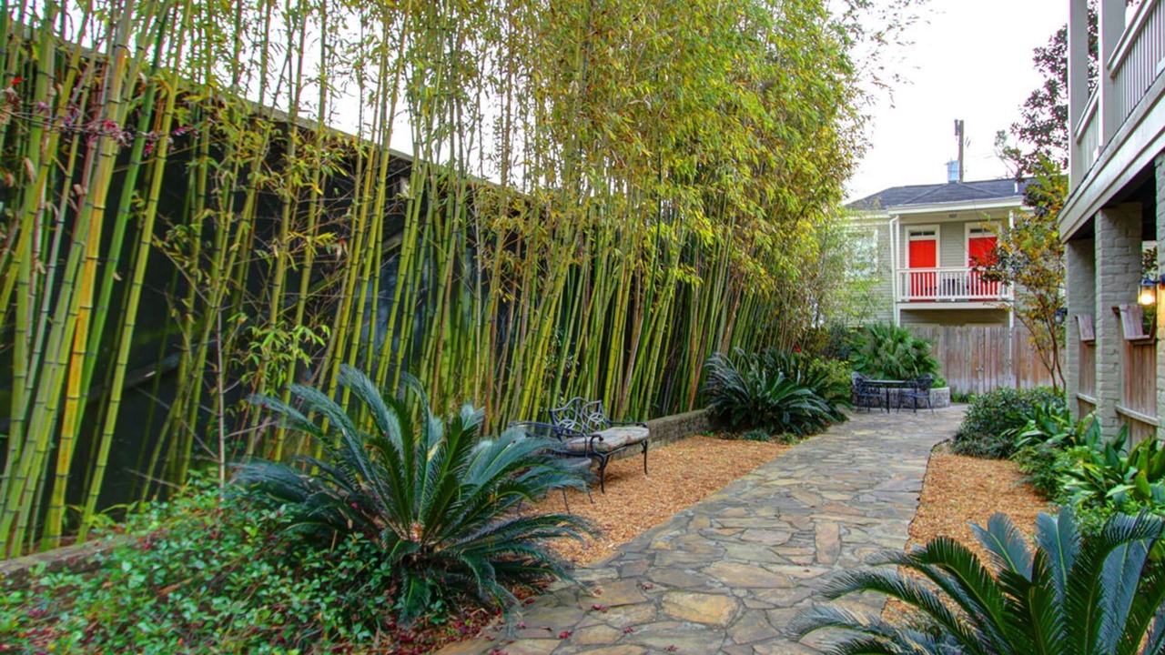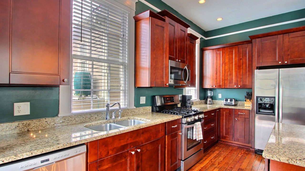 The garden level features a full bath, a bedroom with two queen beds, living room, another bedroom with a queen bed, a full bath in the hallway, washer dryer, fully equipped kitchen with granite countertops and stainless steel appliances, and a breakfast table with seating for 4. In summary, the garden level has 2 bedrooms, 2 baths, and sleeps a total of 6 people.
