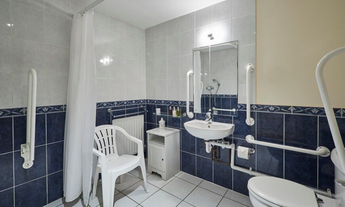 The ensuite bathroom is modern and well-equipped. Designed as an accessible wet room, it features a shower and a bright, contemporary feel.