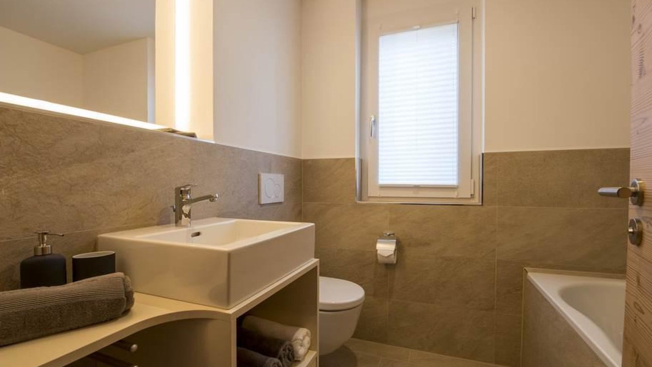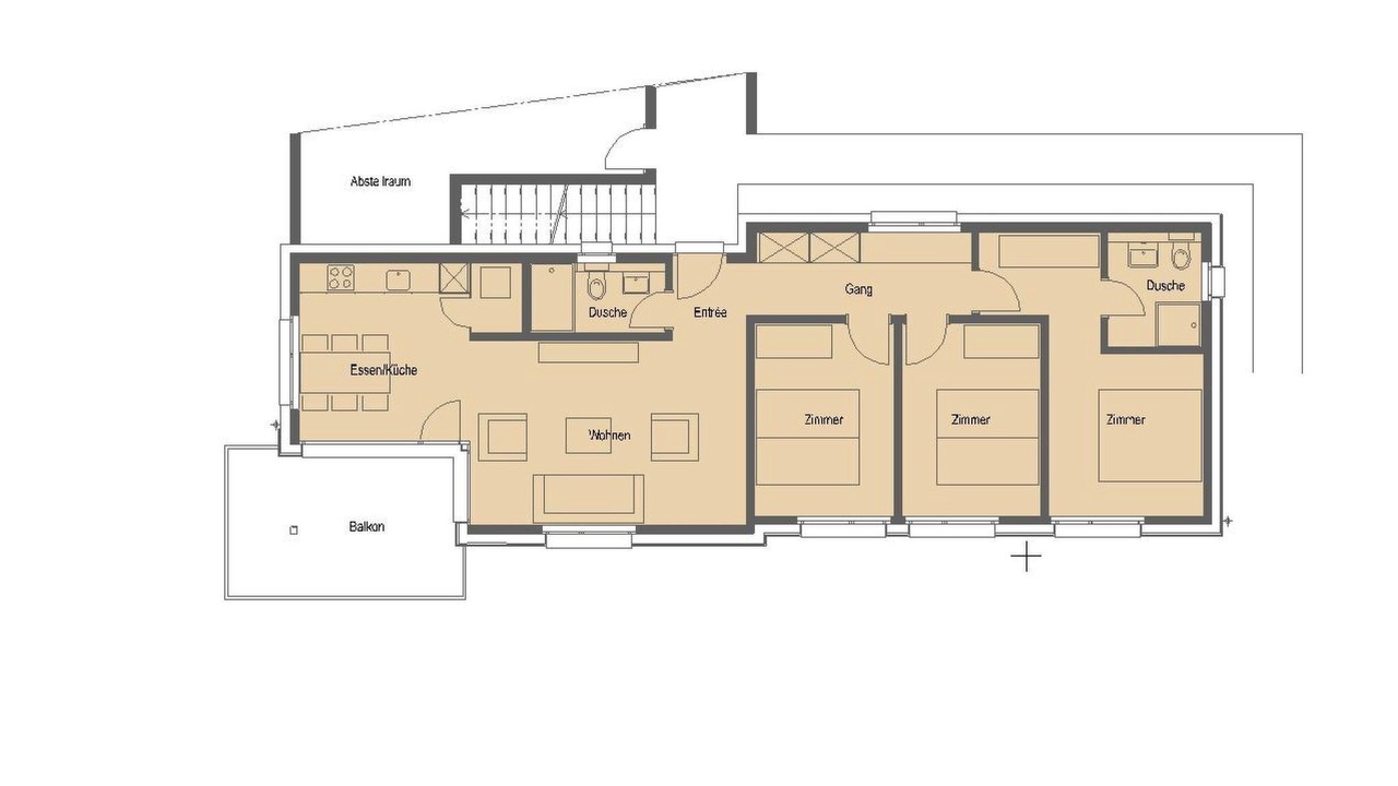 The 4 1/2-room apartment features three bedrooms: two rooms with two single beds each and one room with a double bed. The apartment is equipped with two bathrooms – one with a shower and WC, the other with a bathtub and WC. The open kitchen is equipped with a dishwasher and leads to a spacious living area with direct access to the sunny south-facing balcony.