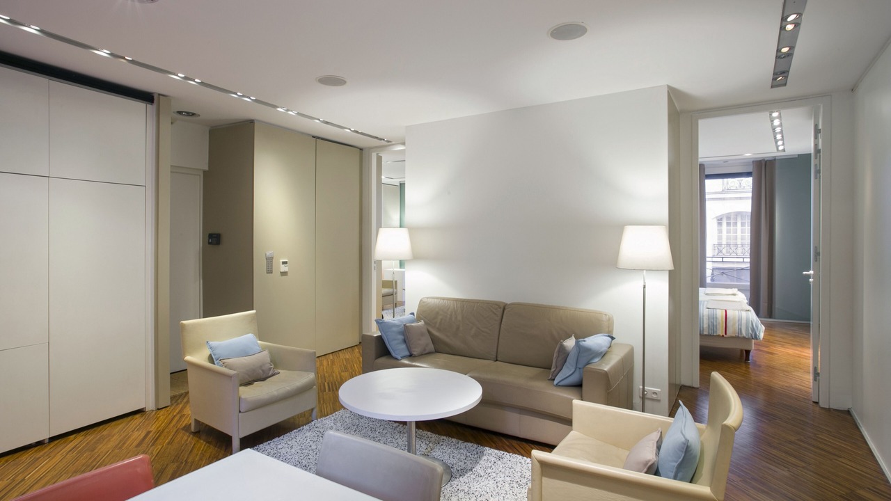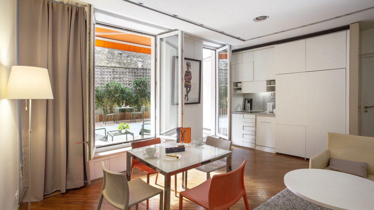 On the first floor above street level (in an elevator-equipped building), one is greeted by a salon with large windows opening onto a terrace. The exterior walls of the apartment are made of translucent glass. The concealed track-lighting is controlled by dimmers. A small efficiency kitchen contains a microwave oven, an induction stove top, a dishwasher. A Miele washer and dryer are provided for the guest’s laundry needs. The bathroom has a large shower booth, à l’italienne. The master bedroom offers a large, flat screen, high definition television with a fiber optic connection (which also means high-speed wifi connections) as well as a seating area, a modern, centralized stereo system, with built in ceiling speakers, brings sound to each room. A smaller bedroom offers modular twin beds, that can be joined together if needed. The apartment is furnished with several, comfortable, leather armchairs and a leather couch.