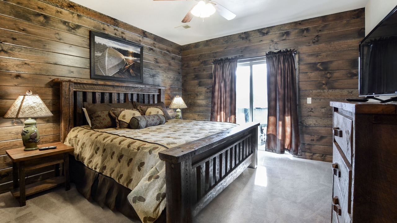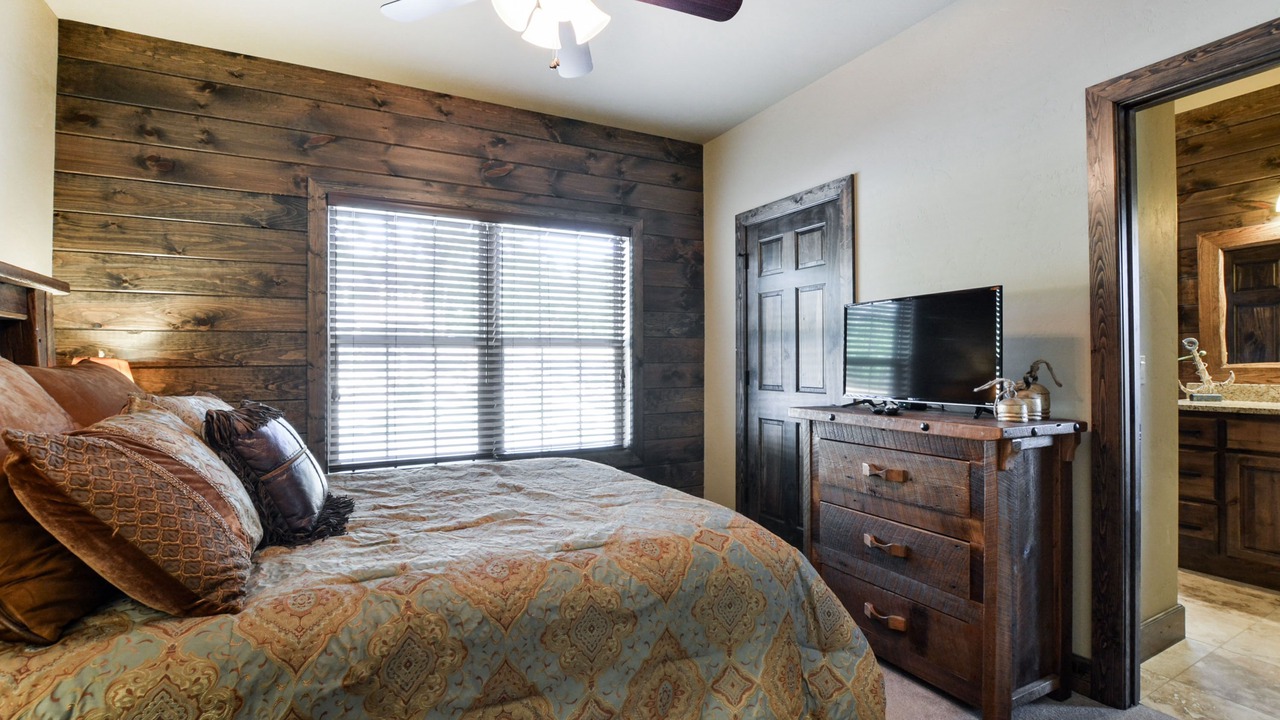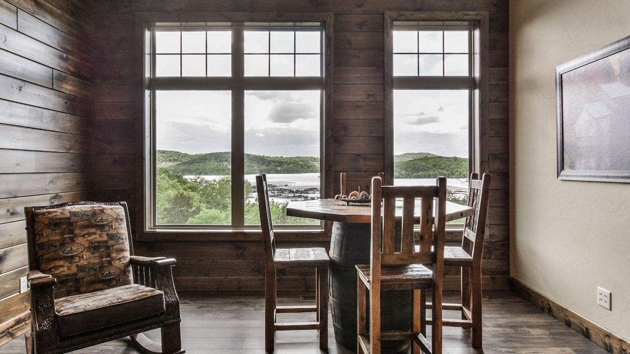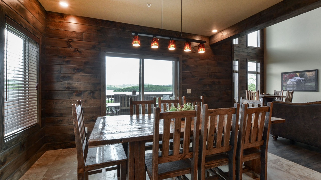 These gorgeous villas are located on gorgeous Table Rock Lake in Branson Missouri. The Villas are fully stocked with virtually everything you will need for your vacation. Also conveniently within a 2 min walk to the shoreline of the lake!! Each side of the unit is three levels. The 5 bedroom side has 4.5 baths and a Theater room with Stadium seating and a 70" smart TV. The 6 bedroom side has a double bunk room instead of the theater room. Each side of the villa has quality beds and furniture, 4 full bathrooms with 2 MASTER king suites and a fully equipped gourmet kitchen with stainless steel appliances and a top of the line Weber Gas Grill (with propane included) located right outside on the main deck. When you combine both sides, you will get 6 total decks; two small balconies off the master bedrooms, two large main level decks with weber gas grills and four quality 6 seat patio sets, two lower-level screened in patios with furniture. Inside the Villas, you will find custom high-quality furnishings, wagon wheel lighting fixtures, Natural Slate and Travertine tile floors, and solid granite countertops. All of the bedrooms have flat-panel TVs, luxury bedding, and only the BEST mattresses available! The main level living area has charming tongue-and-groove wood ceilings and walls and a majestic 28-foot floor-to-ceiling River Rock stone fireplace, complete with a wall of windows.
