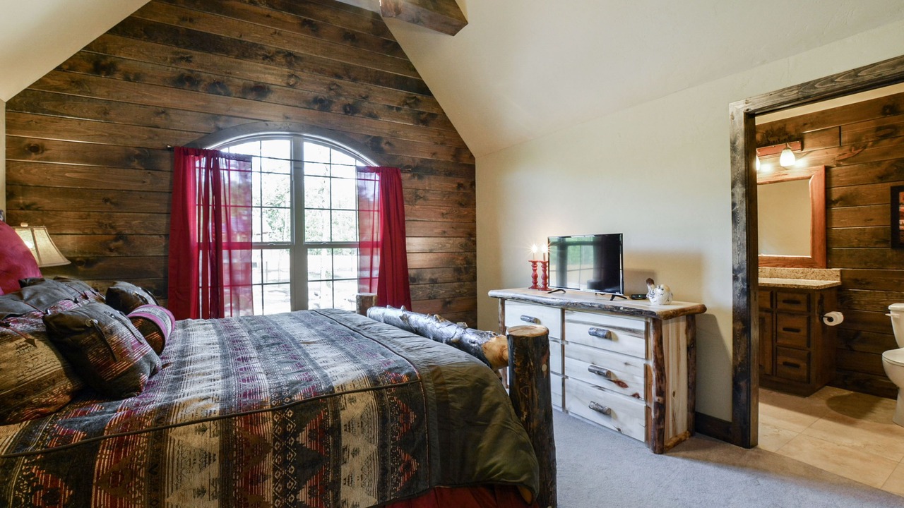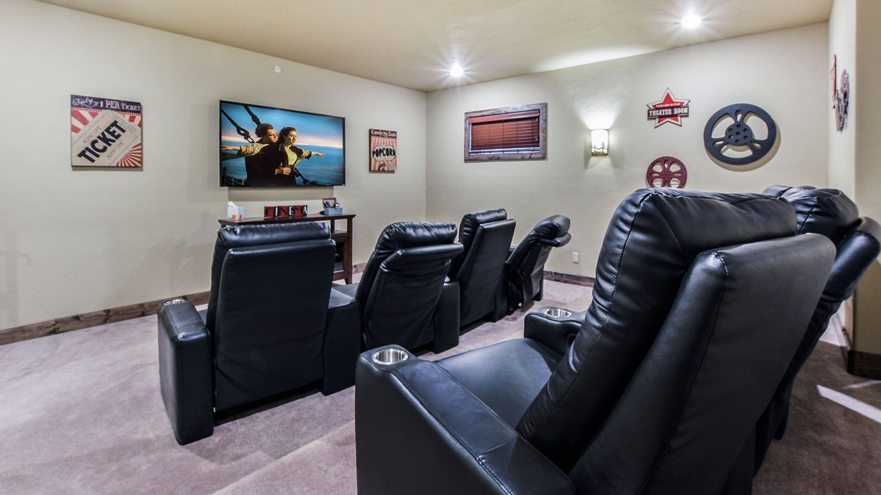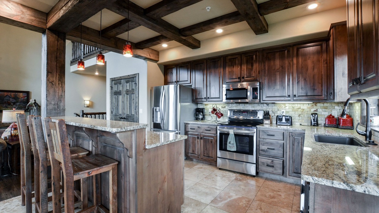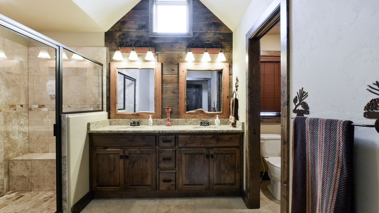 These gorgeous villas are located on gorgeous Table Rock Lake in Branson Missouri. The Villas are fully stocked with virtually everything you will need for your vacation. Also conveniently within a 2 min walk to the shoreline of the lake!! Each side of the unit is three levels. The 5 bedroom side has 4.5 baths and a Theater room with Stadium seating and a 70" smart TV. The 6 bedroom side has a double bunk room instead of the theater room. Each side of the villa has quality beds and furniture, 4 full bathrooms with 2 MASTER king suites and a fully equipped gourmet kitchen with stainless steel appliances and a top of the line Weber Gas Grill (with propane included) located right outside on the main deck. When you combine both sides, you will get 6 total decks; two small balconies off the master bedrooms, two large main level decks with weber gas grills and four quality 6 seat patio sets, two lower-level screened in patios with furniture. Inside the Villas, you will find custom high-quality furnishings, wagon wheel lighting fixtures, Natural Slate and Travertine tile floors, and solid granite countertops. All of the bedrooms have flat-panel TVs, luxury bedding, and only the BEST mattresses available! The main level living area has charming tongue-and-groove wood ceilings and walls and a majestic 28-foot floor-to-ceiling River Rock stone fireplace, complete with a wall of windows.