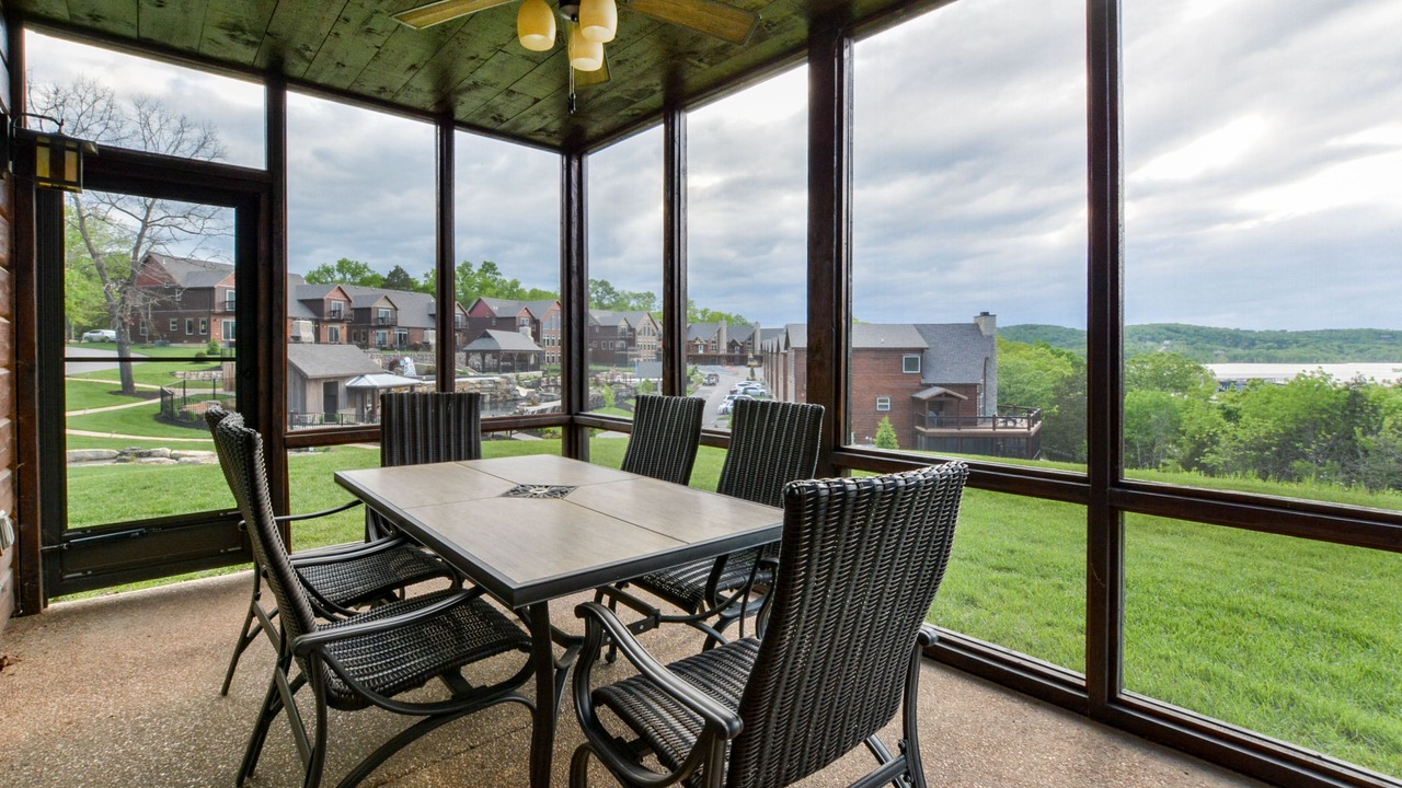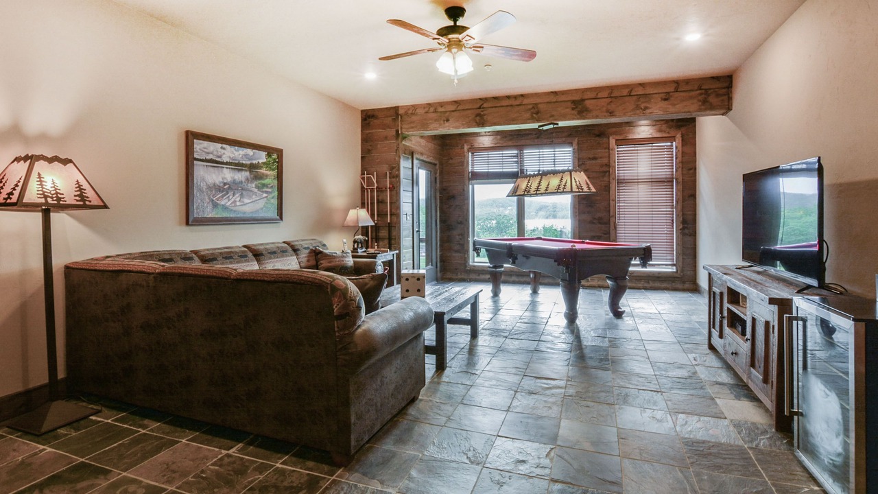 The TWO upstairs Master Suites on each side have custom hand made king size beds with top of the line mattresses. Each master suite has a full luxury bath with granite countertops and one with a natural travertine tiled shower. One master has a small outside balcony with views of the "main pool" and lake, and both masters have flat panel TV's. Two guest bedrooms on the main level have queen size beds and share a full size Jack in Jill bathroom. On the lower level walkout basement, there are two more bedrooms, one HUGE BUNK ROOM bedroom furnished with TWO full over queen bunk beds. You can sleep up to 8 people just in this bedroom alone! The second bedroom in the 6 bedroom unit lower level is adorned with a King Size bed with a sliding glass door that leads to the screened-in patio. The downstairs living areas have an awesome Entertainment media room with a 55' flat-panel TVs, a full-size pool table and top quality sectional queen sleeper. There are also two full-size laundry rooms with top of the line washers and dryers and an additional small size refrigerator for those extras. Lastly, the screened-in patio is accessed from the lower walkout level and provides outdoor enjoyment great views of Table Rock Lake or the incredible pool in a bug-free environment.