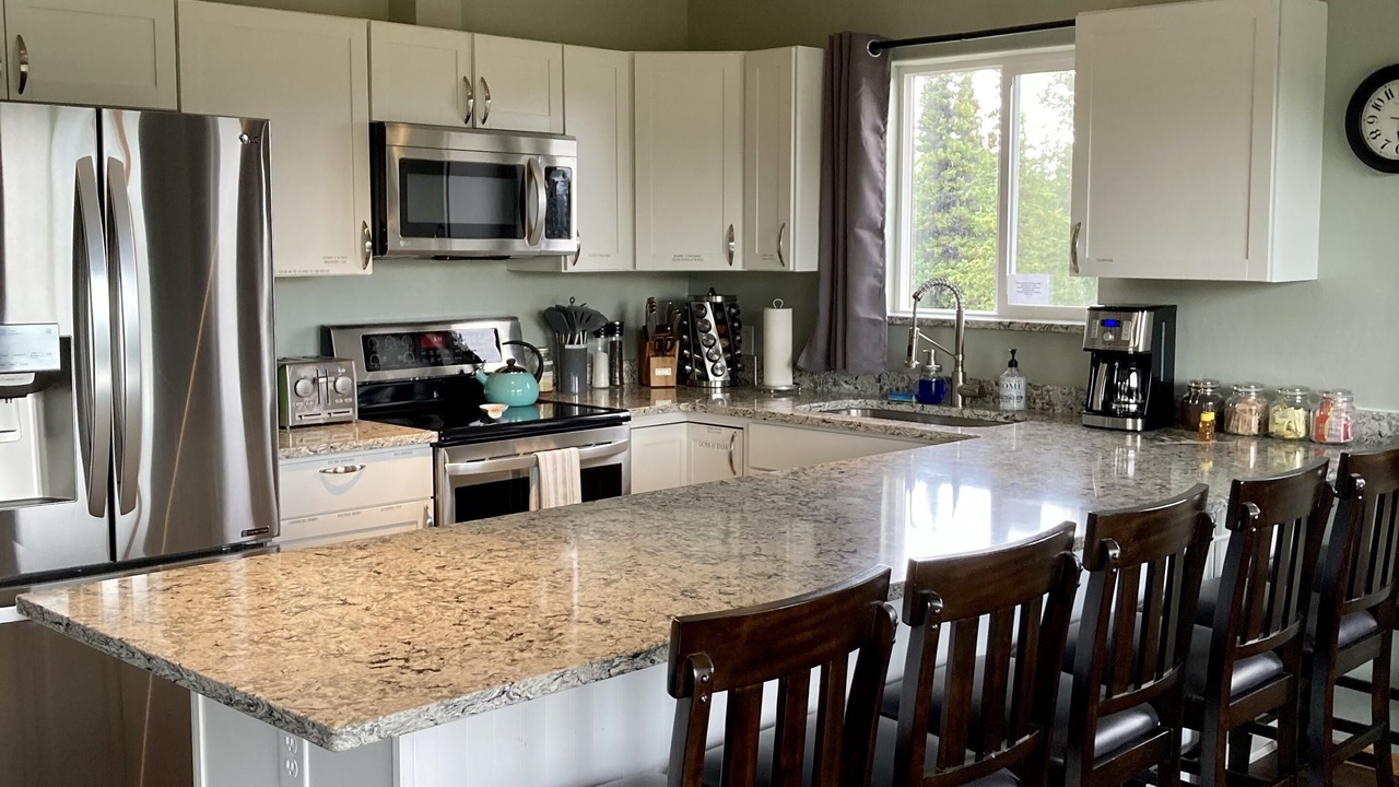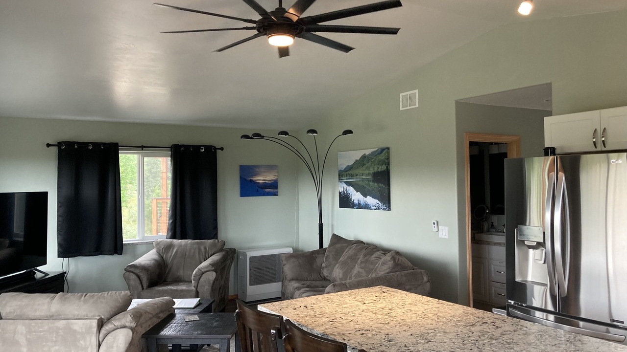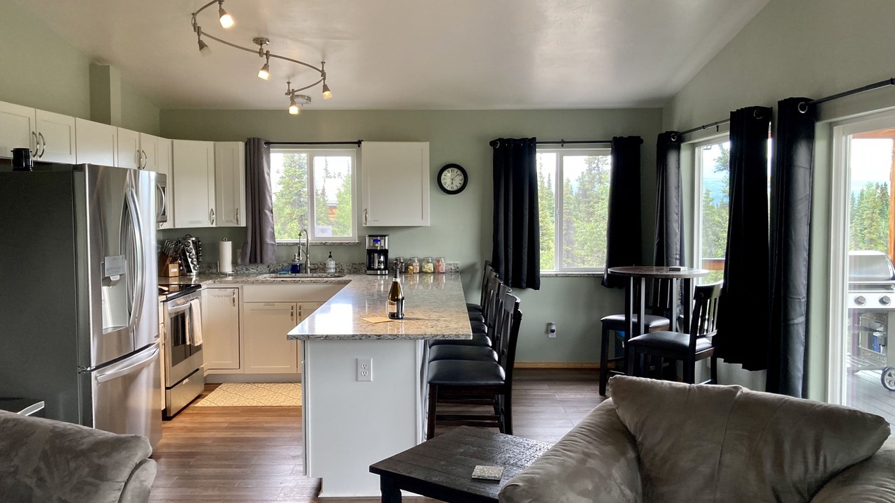 The living room has a sleeper sofa, love seat, end tables with lamps and a 65” High Definition Television. You’ll be able to enjoy watching a variety of specialty television apps as well as satellite television with local Alaskan channels so you can always be informed of the changing weather. With windows throughout the living room, kitchen and dining areas, a large ceiling fan will provide that fresh, open air feeling.
