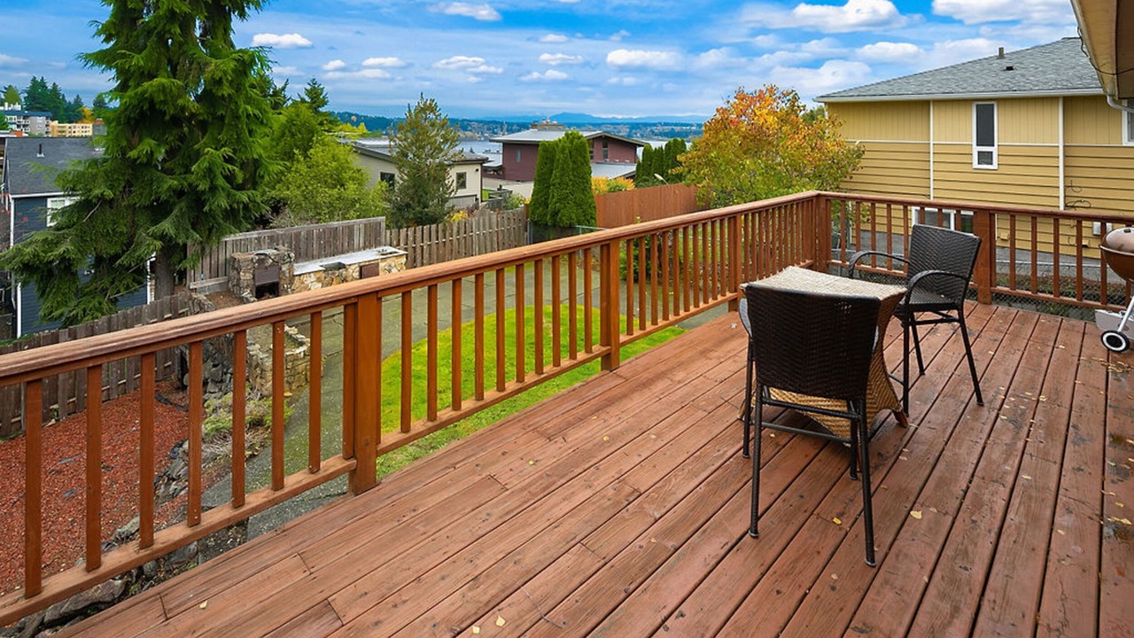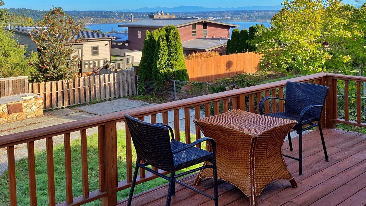 • Large upper floor balcony with gorgeous views of Lake Washington and mountains