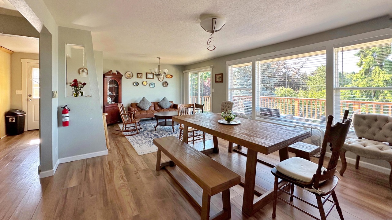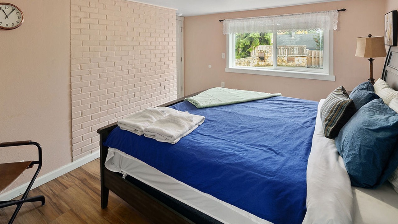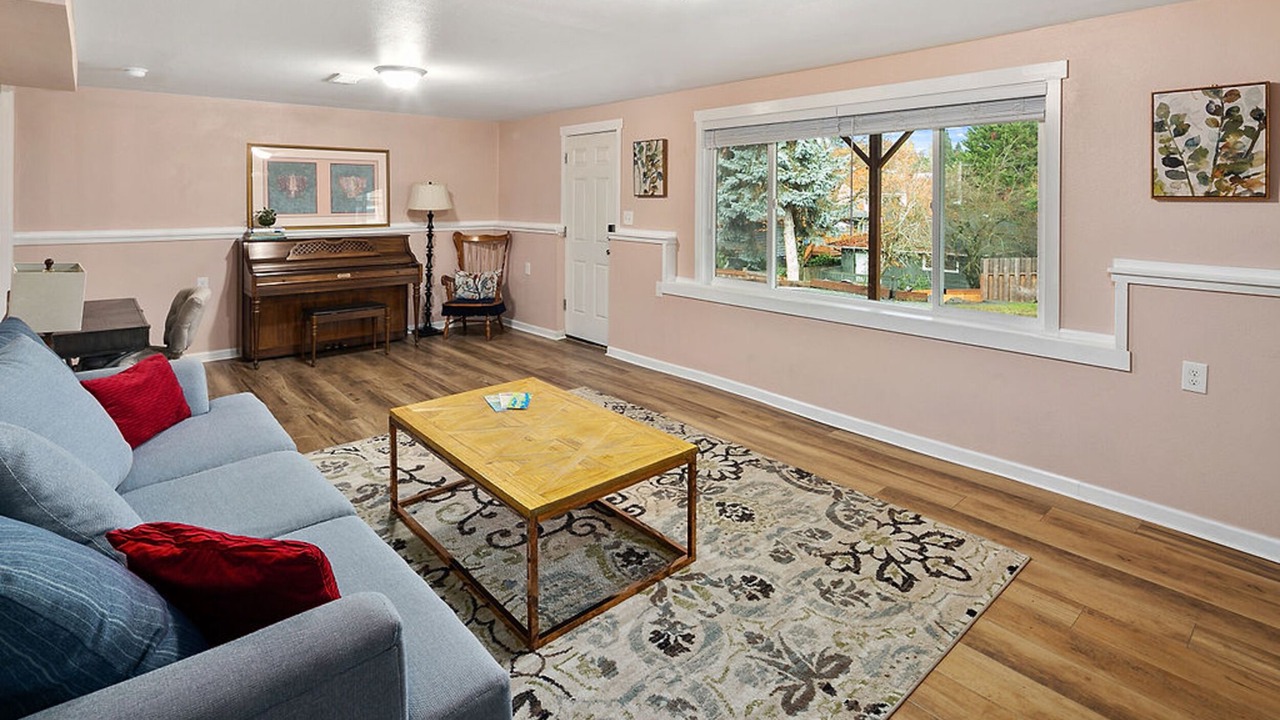 • First Floor: living room with smart TV, dining room, kitchen, 2 bedrooms (one with king bed and another with queen bed), 1 bathroom, access to outdoor balcony with views of Lake Washington