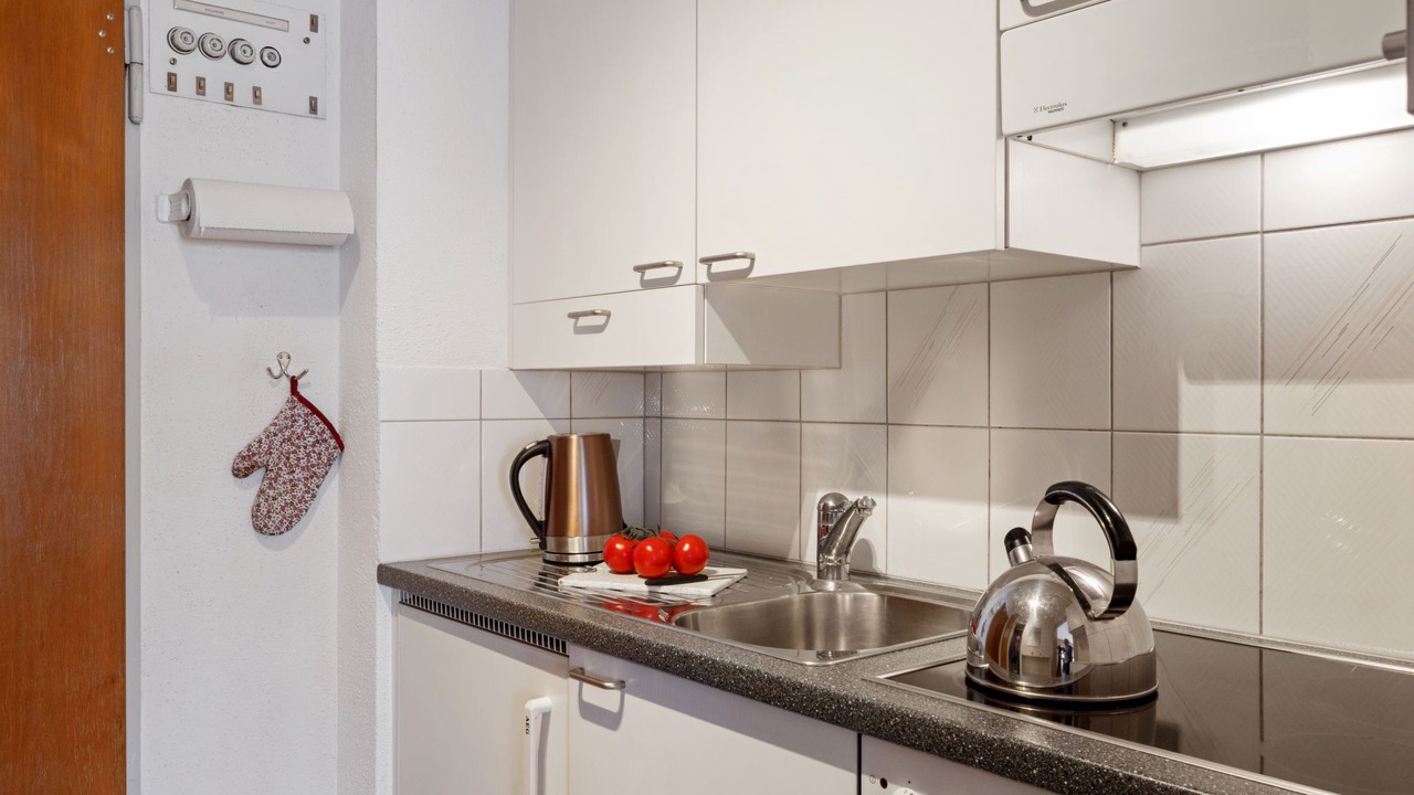1-room apartment 28 m2 on 1st floor. Cosy furnishings: living/dining room with 2 fold-away beds and TV connection (flat screen), radio. Exit to the balcony. Kitchenette (oven, 4 ceramic glass hob hotplates). Shower/WC. Balcony, east facing position. Balcony furniture. Beautiful view of the mountains, the countryside and the resort. Facilities: Internet (WiFi, free). Please note: non-smokers only.