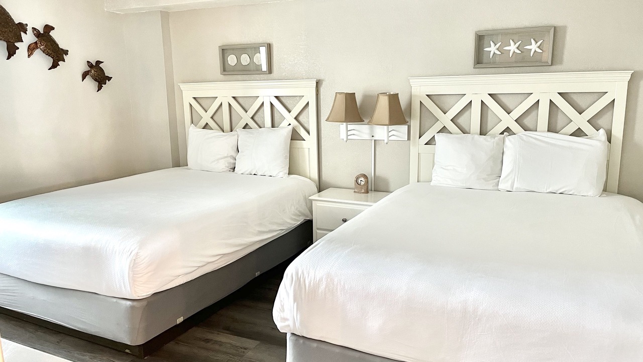 The master bedroom boasts a large king-sized bed with a pillow top mattress, wall mounted TV with DVD player, private bathroom with a shower/tub combination, an oceanfront view and an entrance to the large oceanfront wrap around balcony. Adults will enjoy the large second bedroom with two queen beds (most other condos have two doubles). There is also a wall mounted TV with a DVD player located in the second bedroom. The living room sofa converts to a queen-sized bed allowing the condo to sleep eight. The living room has a 47” wall mounted TV for your enjoyment along with a Blu-ray/DVD player. The newly renovated kitchen is fully equipped with all appliances, plates, silverware as well as waffle maker, toaster, coffee pot, Keurig, crock pot and of course a blender for the drinks by the pool! The condo also includes a washer and dryer. The second bathroom has a shower/tub combination.