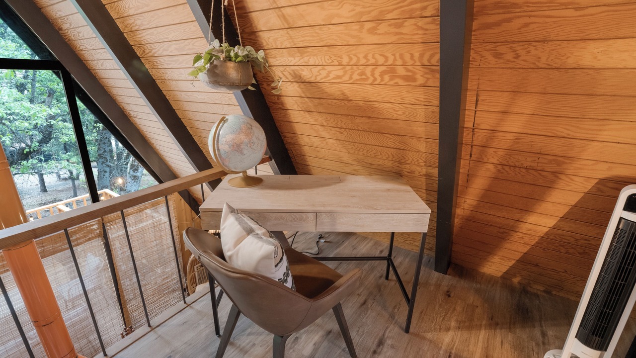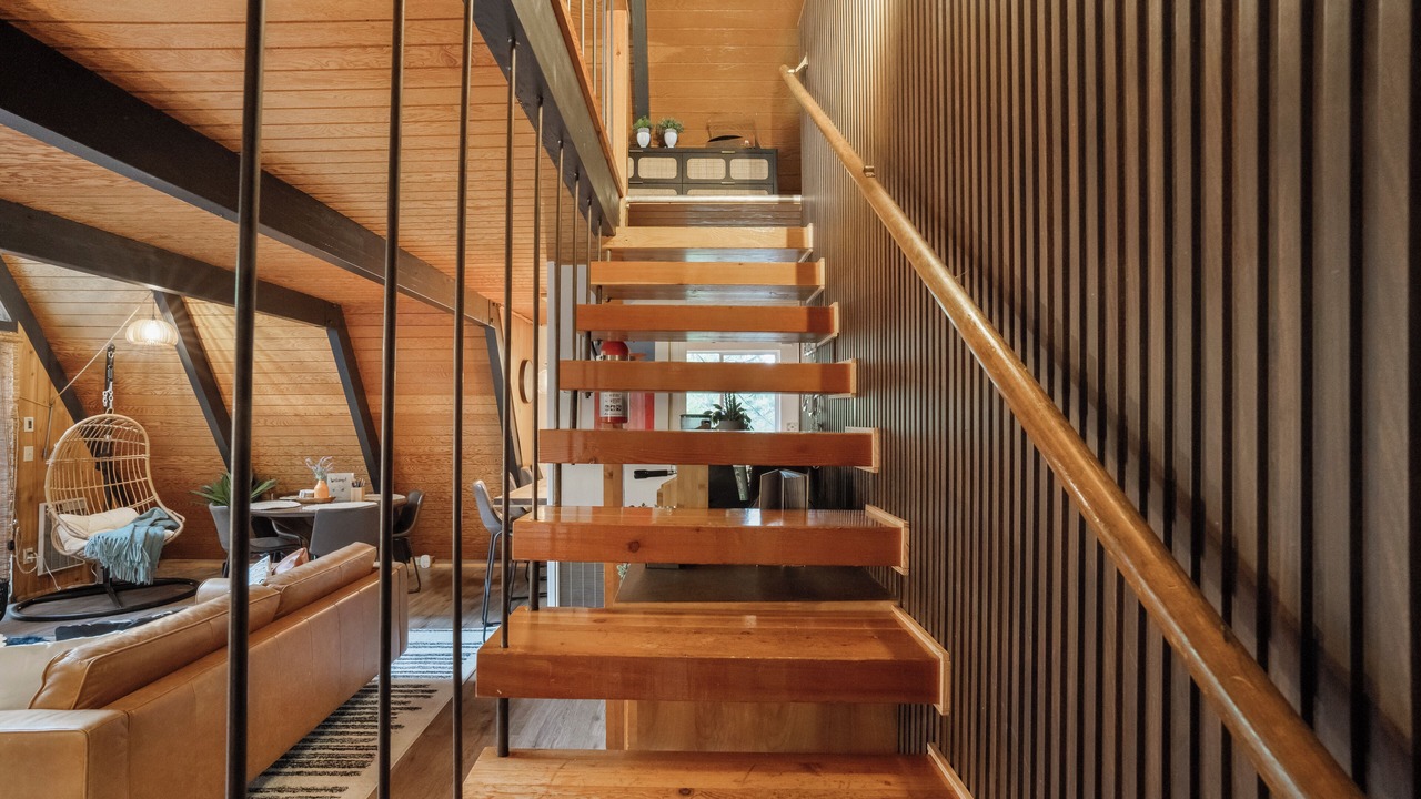 The cabin blends cozy A-frame charm with modern style — warm wood accents, clean lines, and floor-to-ceiling windows that flood the space with natural light and forest views.