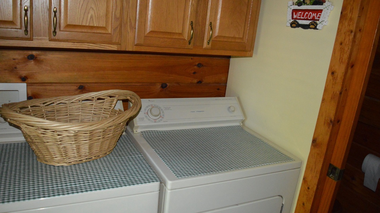 The lower level contains the living room area, kitchen and dining area, a bedroom with an in suite bathroom. There is also a half bath and laundry area with washer and dryer for our guests to use.