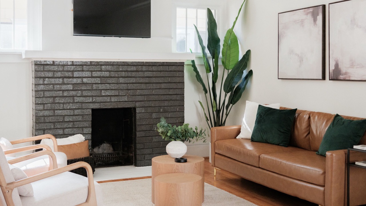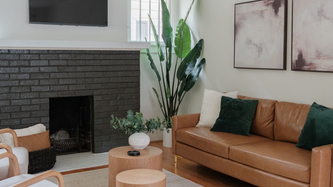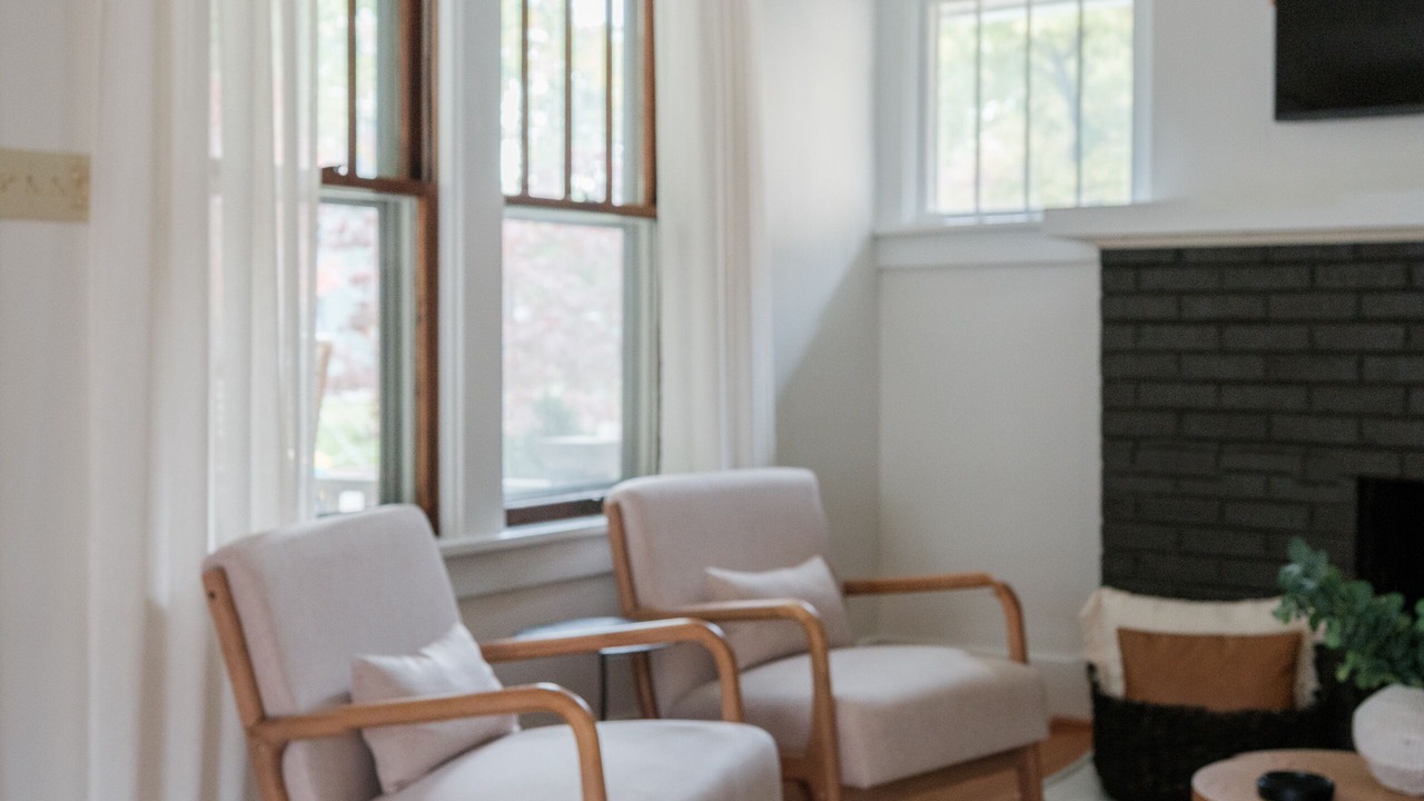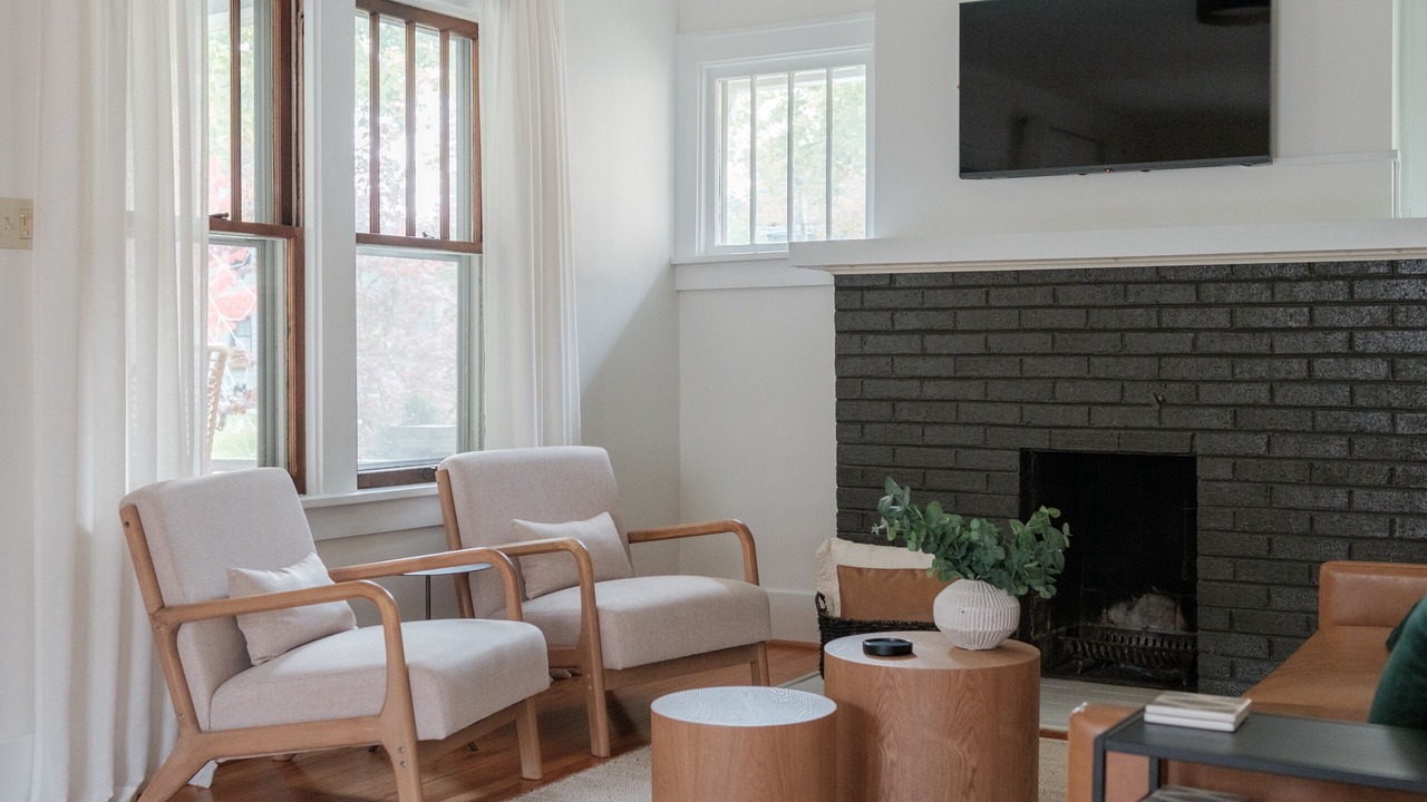 Relax on the comfortable furnishings in the living room and enjoy the airy feel, provided by natural light streaming in through oversized windows. You’ll find an ideal setup for conversing, with a sofa and two chairs facing each other. Watch movies and more favorite programming on the TV using a Fire stick to access streaming channels or apps.