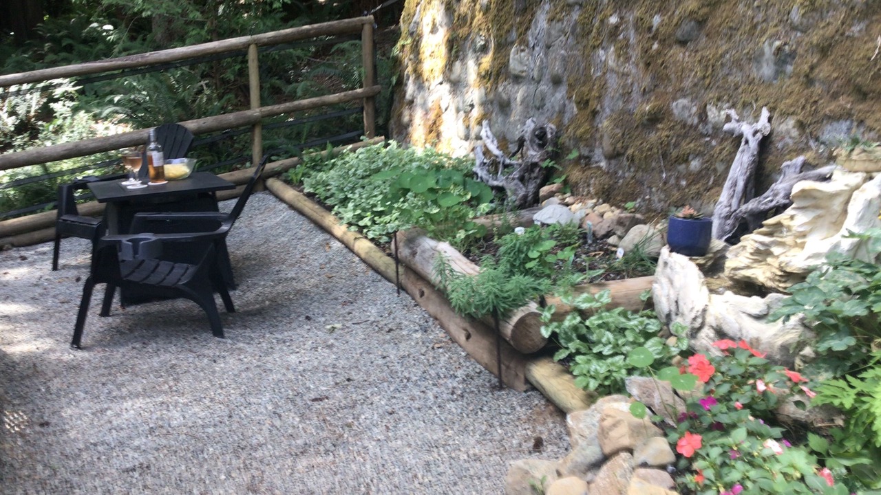 Enjoy the privacy and comfort of this very special property. Serenely nestled by the beauty of the West Coast Evergreens, you will be able to feel a true Vancouver Island experience. The entry deck has a guest garden with herbs, the tranquil sound of a trickling fountain, both a propane BBQ, with a live edge bench to sit on while you are preparing your meals, and fire table for warm cozy outdoor evenings, as well as motion sensors to light the entrance and stairs. As you step inside, our artistically crafted Yurt style cabin welcomes you with beautiful woodwork throughout. The French Doors open to a second deck, which is overlooking a pasture with majestic trees and a seasonal creek (frequented by wildlife) with the occasional sound of a foghorn and distant waves. There is a very comfortable reclining loveseat and chair in front of an electric fireplace, a bookshelf with lots of information about local areas, plus more interesting and intriguing subjects and games. Smart TV, free Netflix. The queen size bed has an award winning Nectar mattress and pillows (guest favourite), extra blankets and throws, plus lots of storage in the dresser and Armoire for clothes. Full kitchen has everything you need with seating at the island and at the dining table. The bathroom includes a shower with a fold down seat in front of it, lots of towels as well as washer and dryer. There is direct access to acres of forest trails off property. It is a two minute drive to Gordons Beach. Further up the coast there are many spectacular Provincial parks and places to explore, offering amazing hiking and views. You will see several great places to stop in along the way up the coast to get delicious goodies and special drinks to take with you on your adventures . We are 8km from the village of Sooke where you can find world class fishing, whale watching, kayaking and paddle board rentals. There are also a variety of places for dining and artisan shops as well as three unique local breweries. We feel very grateful to be living is such a wonderful area and love to share it with our guests. We hope to be able to welcome you here for an unforgettable stay.